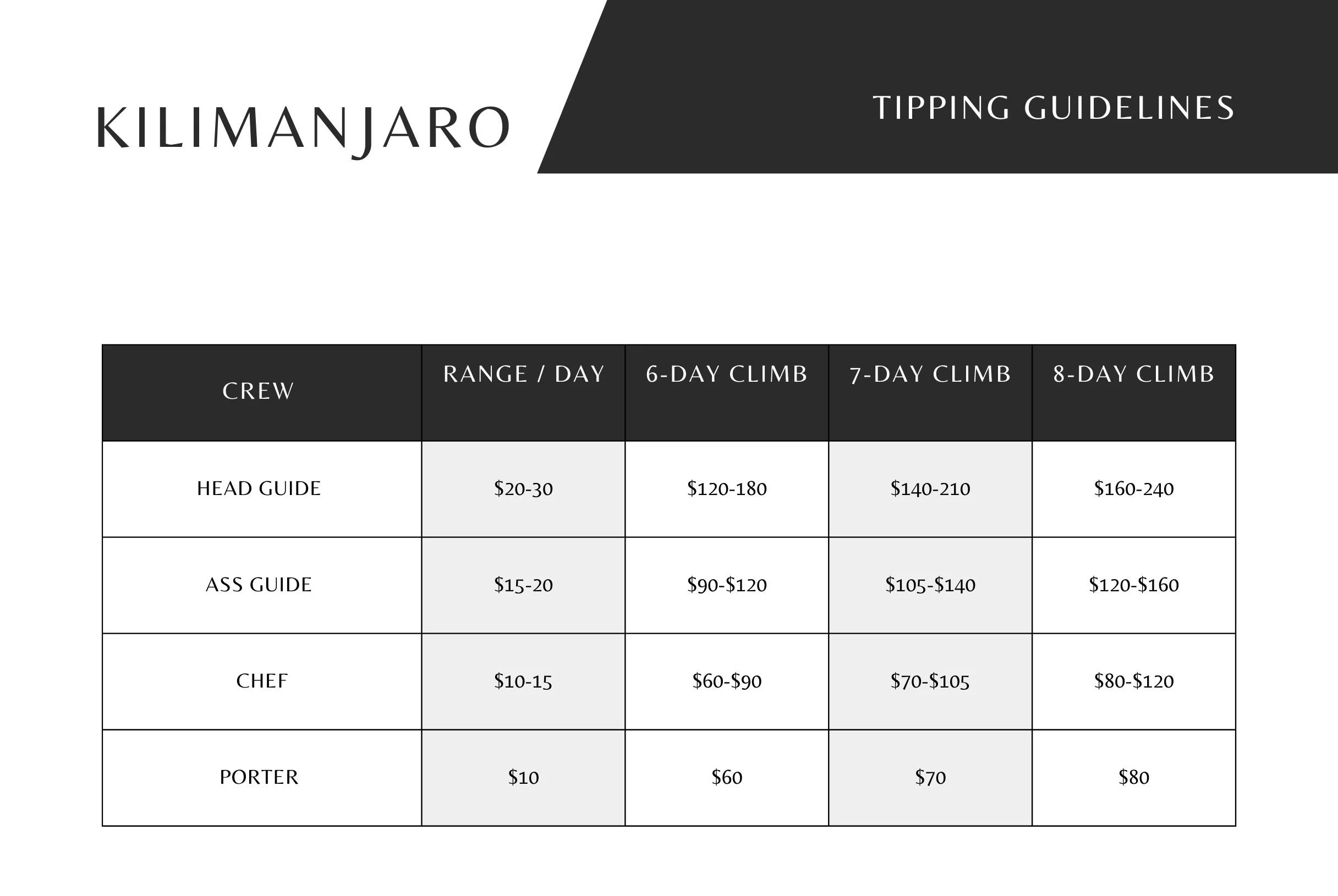 It is customary to give tips on the final morning of the climb. We recommend tipping each crew person directly. If you choose to give the full tip to the guide to distribute, please announce the total amount in front of the entire crew and the tip amount each crew member is to receive. The guide should repeat this in English and Swahili so that all can understand.